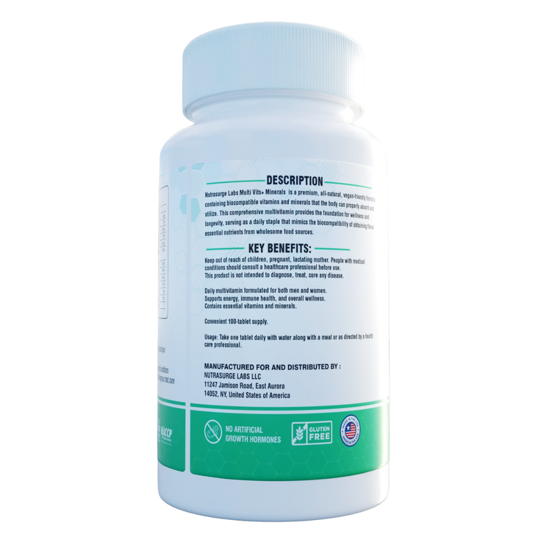 Nutrasurge Labs Multi Vits + Minerals is a premium, all-natural, vegan-friendly formula containing biocompatible vitamins and minerals that the body can properly absorb and utilize. This comprehensive multivitamin provides the foundation for wellness and longevity, serving as a daily staple that mimics the biocompatibility of obtaining these essential nutrients from wholesome food sources.